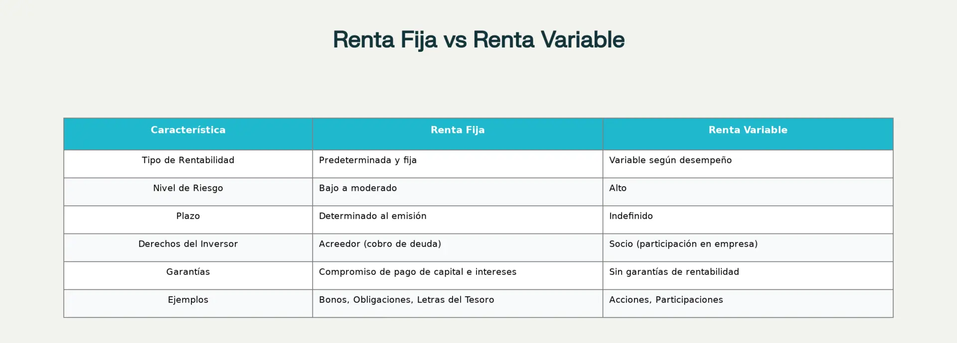 Los instrumentos de renta variable no tienen predeterminado ni su valor, ni el plazo ni el rendimiento. El principal instrumento de esta categoría son las acciones, que representan una participación en el capital social de una empresa.