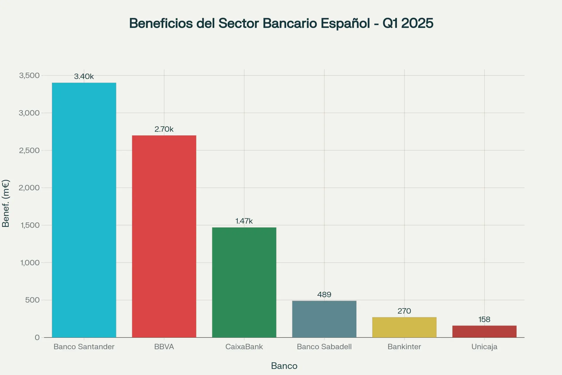Banco Santander lideró las ganancias con 3.402 millones de euros (+19%), seguido de BBVA con 2.698 millones (+22,7%). CaixaBank obtuvo 1.470 millones (+6,9%), mientras que Banco Sabadell destacó con el mayor crecimiento relativo, disparando sus beneficios un 58% hasta los 489 millones.